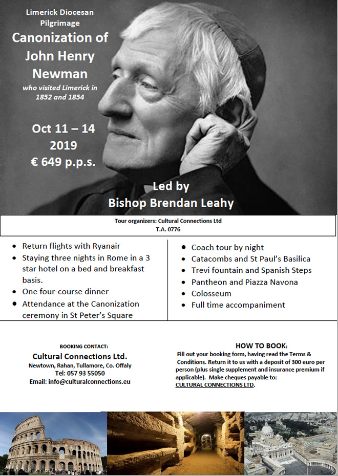 25 Jul Pilgrimage to Rome led by Bishop Brendan Leahy Canonization of John Henry Newman who visited Limerick in 1852 and 1854 Download Brochure here